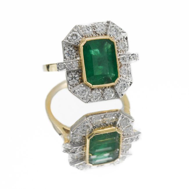 An 18ct yellow & white gold ring set centrally with an emerald cut emerald, approx. 3.00 carats, surrounded by round brilliant cut diamonds, total diamond weight approx. 1.26 carats, 7.16gm, size O to O 1/2, (stones measured within the restrictions of their settings).t