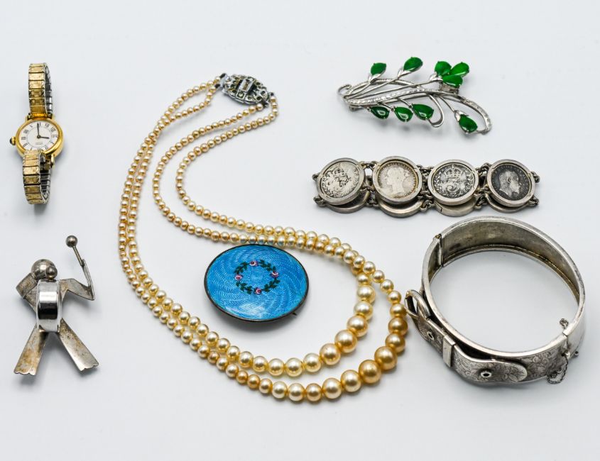 An interesting mixed lot to include an antique silver engraved belt buckle bangle, 28.13gm, a silver threepenny coin bracelet, 39.89gm, a silver 'drummer boy' brooch, 11.12gm, a silver circular brooch with blue enamelling & hand painted flowers, 8.16gm, a brooch with green stones, a double strand of faux pearls & a Seiko watch.
