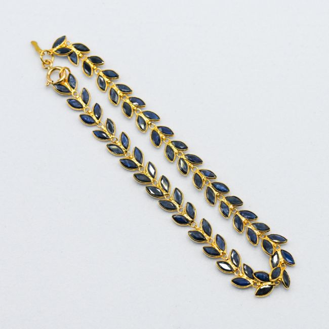 A delicate 'leaf' design 18ct yellow gold bracelet set with sixty-six marquise cut sapphires, total sapphire weight approx. 5.30 carats (stones measured within the restrictions of their settings and each stone varies in size), length 18cm, 4.40gm.