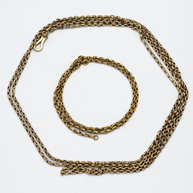 A gold 'Keepers' chain, length 72cm, approx 22.74g (possibly 9ct not hallmarked) together with another gold chain (not hallmarked) (2).