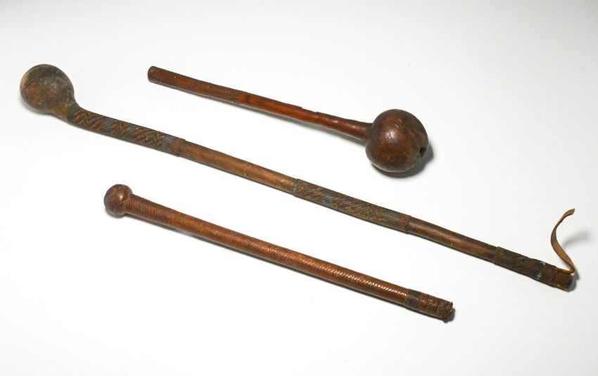Two African wooden knobkerrie together with a leather knobkerrie (3).