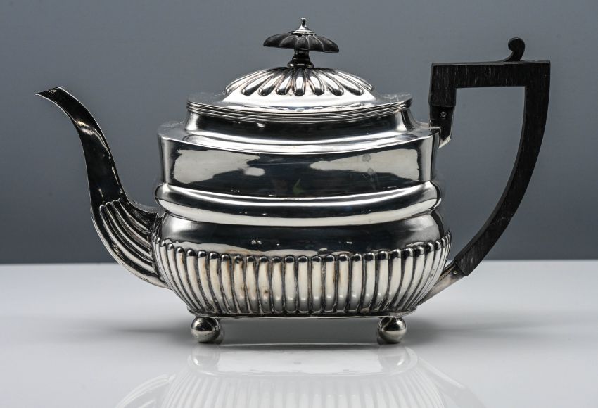George III silver teapot, cushion shape with half fluted body, black carved finial, bun feet, Charles Hougham circa 1808 London, approx. 19.50oz.