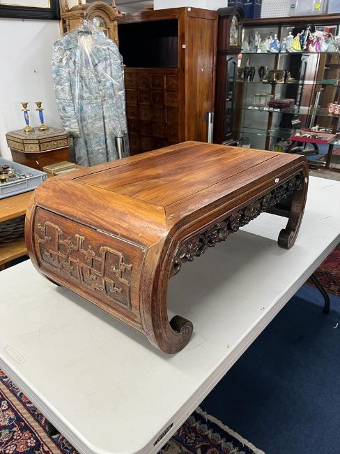 A Chinese hardwood coffee table, carved with the legs forming the scroll ends and the apron carved and pierced in the form of a vine, 33.5 by 78 by 45cm.,