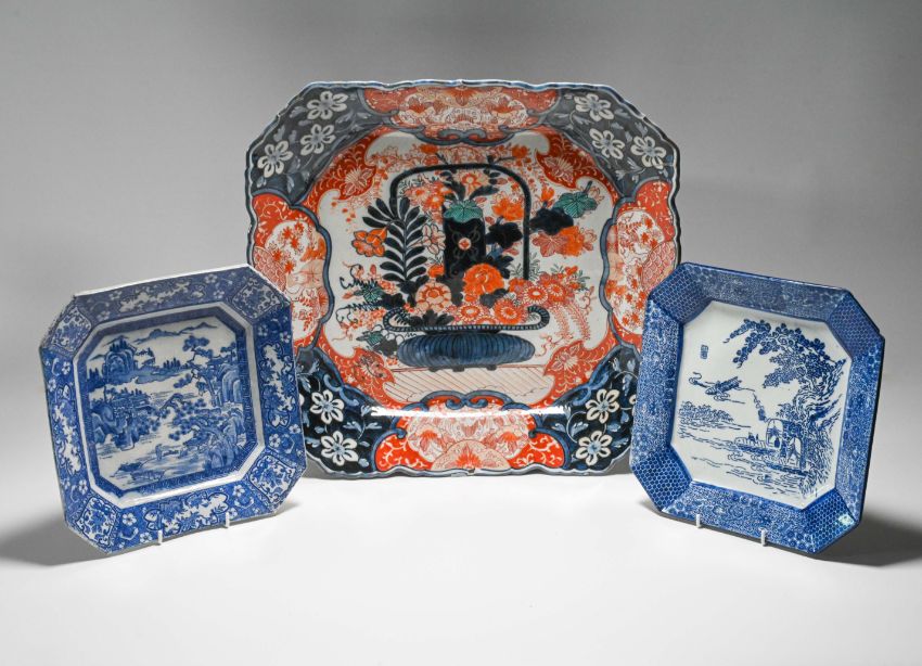 A large Imari Charger, Meiji period, of lobed square shape and decorated in the centre with a basket of numerous flowers within an elaborate border on the flared rim, 52.5cm; together with two blue and white dishes, of canted square shape and transfer printed with differing lake landscape scenes, 31.5 and 32cm;