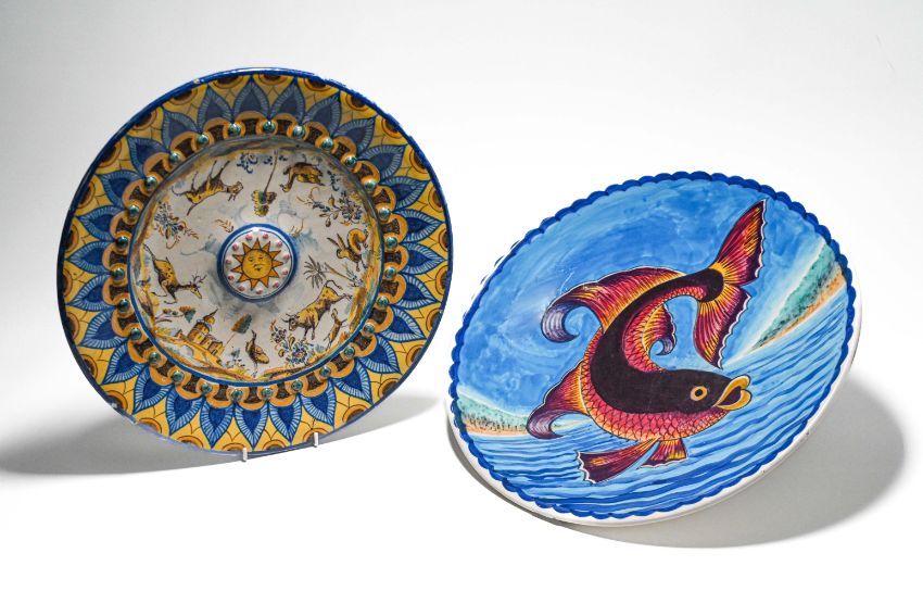 Majolica charger plate together with a hand painted Carp fish wall charger plate (2).
