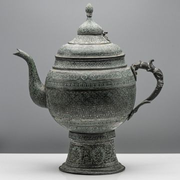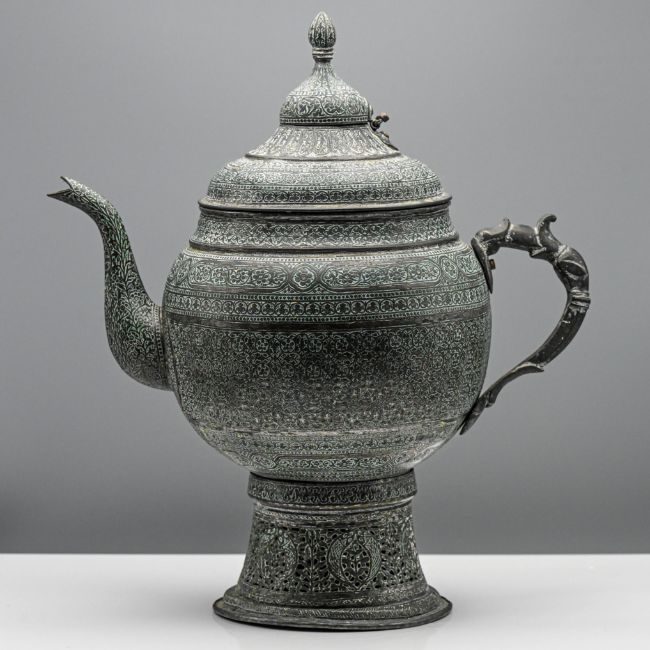 A bronze Samovar, Cover and Stand, the globular body set with an animal mask and tongue handle opposite the curved spout and finely cast overall with numerous foliate bands, the domed cover and tall stand similarly decorated, 41cm;