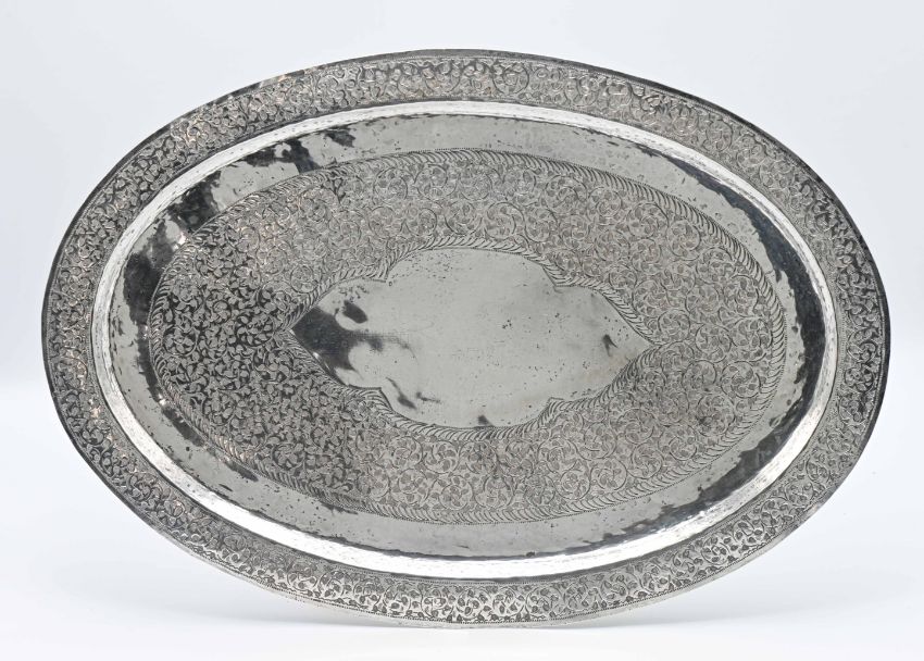 A silver oval platter, impressed mark .800, inscribed 'Handmade Tripoli, Libya B.Hameda', 50cm x 35cm, with chased decoration, approx. 35oz.