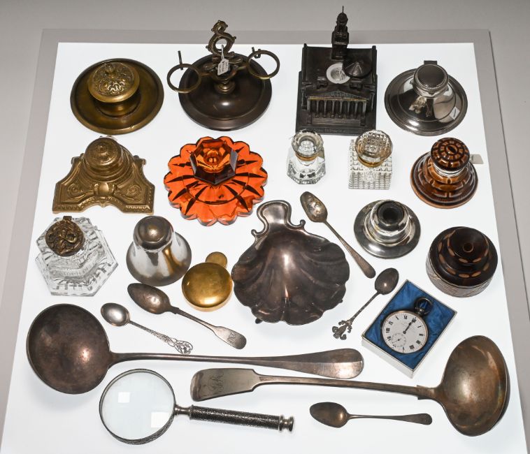 A collection of various Victorian and later inkwells including capstan inkwell together with some large silver plated ladles, some spoons including silver Georgian old English pattern and four other silver tea spoons, magnifying glass and a silver cased open face pocket watch, Liverpool.