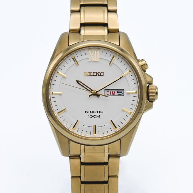 A gents gold plated Seiko Kinetic 100m wristwatch with date calendar.