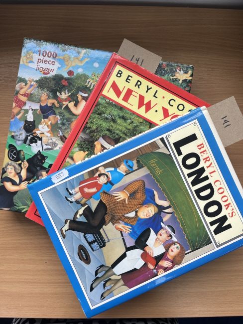 Signed copies of 'Beryl Cook's New York,' John Murray (1985) and 'Beryl Cook's London,' John Murray (1988), with 1000 piece puzzle.