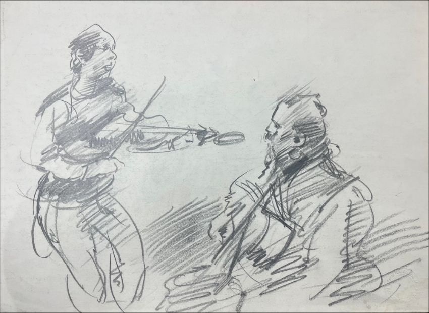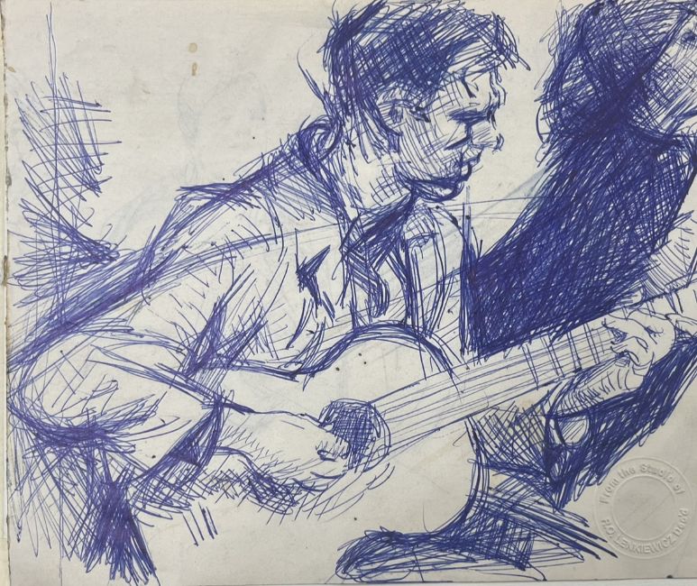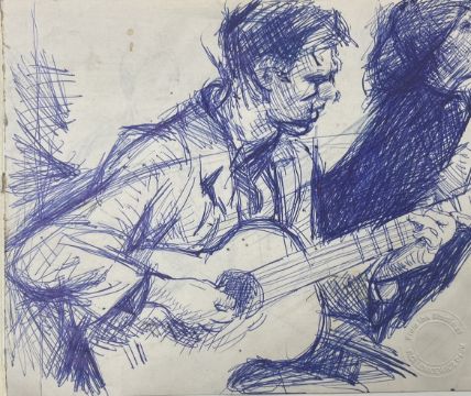 Robert Lenkiewicz (1941-2002) three early drawings in blue biro and pencil, one of the guitarists is possibly Graham Nash of Crosby, Stills, Nash and Young from when they used to hang out with the artist together in a coffee bar in London. Provenance Bearnes estate auction 12 April 2008. largest 30x 43cm, unframed.