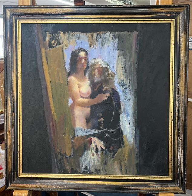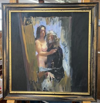 Robert Lenkiewicz (1941-2002), 'Painter with Brunette Model, Standing', oil on board, framed, (60cm x 57cm).