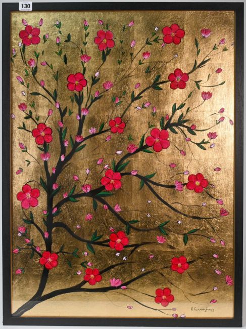 Rosie Cunningham, 'Chinese Blossom Tree' on gold leaf, signed, framed and glazed, 74cm x 55cm. Provenance consigned from the artist studio.