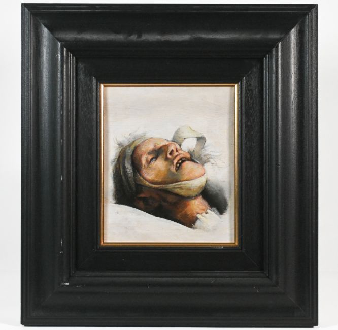 After the death of the artist’s mother Alice in March 1977, Robert Lenkiewicz made sketches at the London mortuary where his mother’s body was taken. Lenkiewicz found his mother’s body on a gurney wrapped in a shroud, her jaw secured with a bandage wound around her head, which he drew from three different points of view. On opening the shroud, he discovered that her toes had been tied together with string. The sketches, about four or five inches on a side, were made in ink on paper in a sketchpad. These five sketches are affixed to the rear of a wood panel on which an oil painting was made three days after her death depicting her bandaged head.