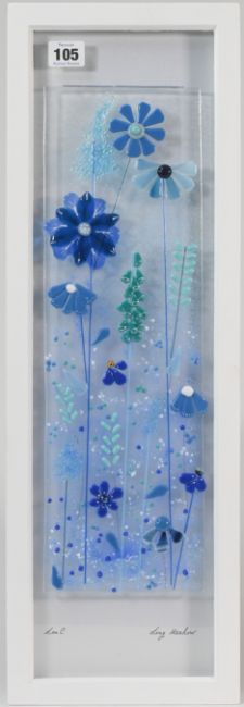 Lou from Lou C fused glass, 'Long Meadow', signed, 60cm x 20cm, framed. Louise is a Plymouth based Glass Artist and is a member of the Plymouth Colour Collective.