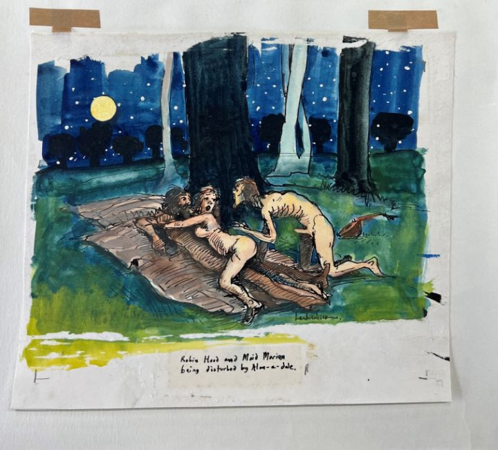 Robert Lenkiewicz (1941-2002) an early original signed watercolour, titled on the image 'Robin Hood and Maid Marian being disturbed by Alan-a-Dale', 25cm x 29cm, unframed.