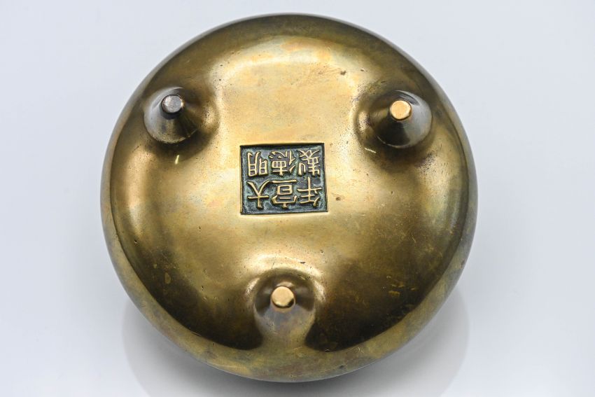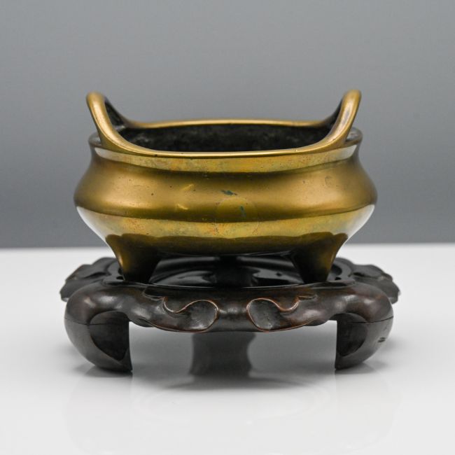 A polished bronze tripod censer, 17th/18th century, the compressed globular body on three short feet and cast with a pair of high loop handles, base with six character ‘da Ming Xuande nain zhi’ mark to base (fitted wood ying and yang stand),