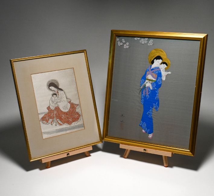 A Japanese Madonna and Child, gouache and gilt on silk, signed and stamped, framed and glazed 47 by 40cm. Overall from the Collection of Arch Bishop of Canterbury Dr Ramsay together with A Japanese embroidered picture of a Madonna and Child, silk, mounted, framed and