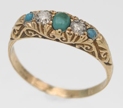 An 18ct turquoise and diamond set ring, indistinct hallmark, size P/Q.