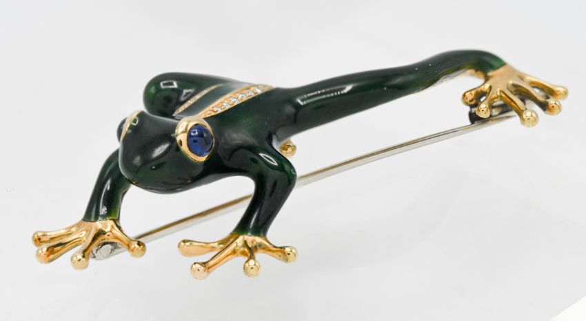 An 18ct gold brooch in a form of a frog enamelled in green with channel set diamonds on its back and cabochon sapphire eyes, length approx. 55mm, 17.04g, stamped 750 and other marks indistinct.