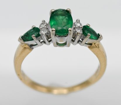 An 18ct yellow gold emerald and diamond ring, size N.