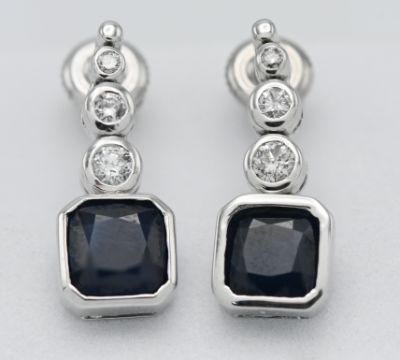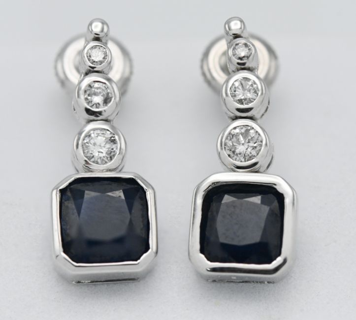 A pair of 18k white gold diamond and sapphire drop earrings, marked on both K18 0.175.
