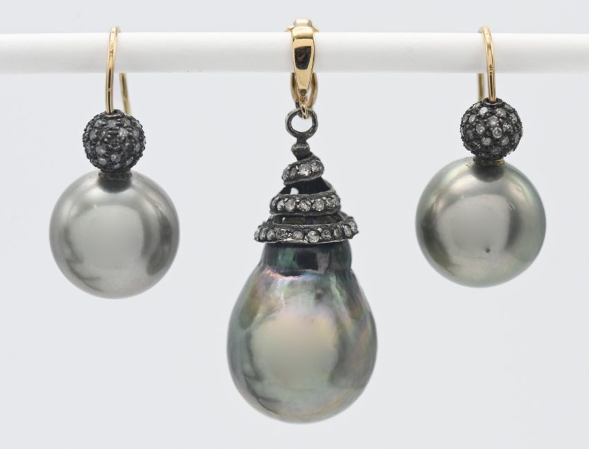 A pearl and diamond suite of jewellery comprising a pendant with spiral twist and matching earrings.