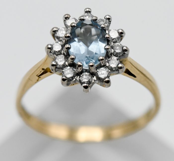 An 18ct yellow gold diamond and aquamarine cluster ring, size P.