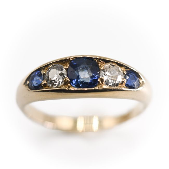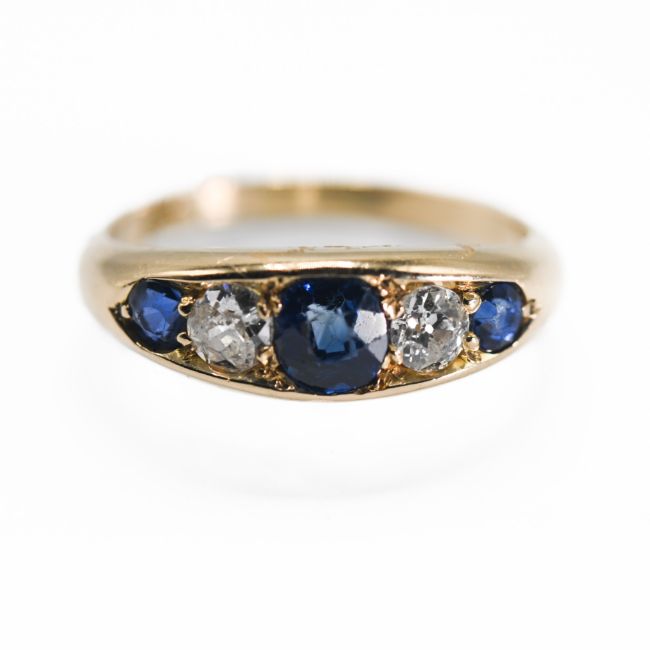 An antique 18ct yellow gold five stone ring set with three sapphires & two diamonds, the central sapphire being oval in shape, approx. 0.50 carats, the two round cut sapphires, total weight approx. 0.20 carats, the two old round cut diamonds, total weight approx. 0.30 carats, (stones measured within the restrictions of their settings), 4.39gm, size P.