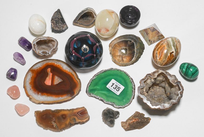 Blue John, a small bowl, diameter 4.5cm and other hardstones etc, approx. 22