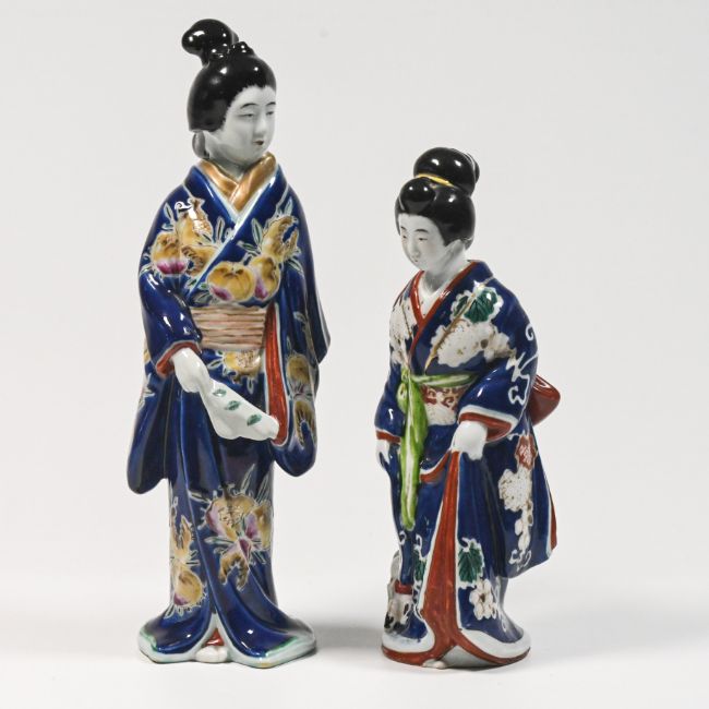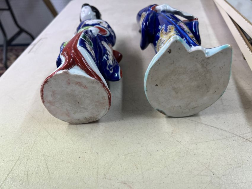 Blue glazed oriental figure in Geisha period costume with fan, height 31cm, together with a blue glazed oriental figure in Geisha period costume with dog at her side, height 25cm.