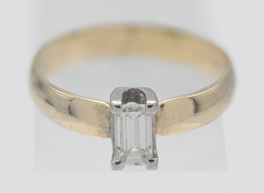 A 14k gold and emerald cut diamond ring, size T.
