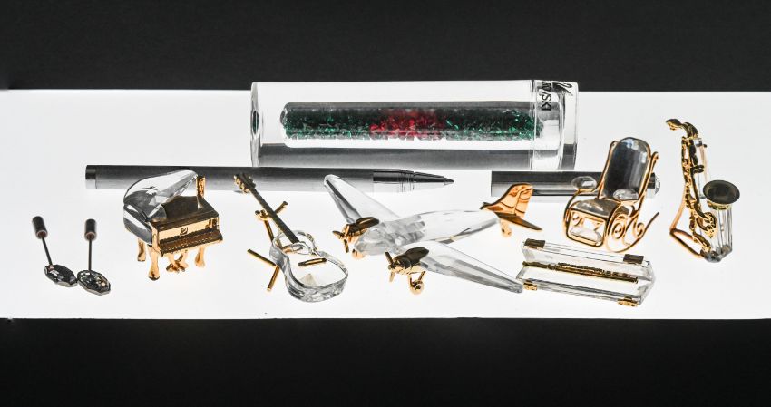 Swarovski Crystal Glass, Collection of eleven small items to include Saxophone, Harmonica, Guitar, Rocking Chair and others, along with a Swarovski Pen and 2 Pencils.