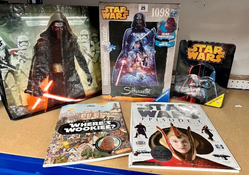 A collection of Star Wars related items including one Ravensburger puzzle, one Make your own AT-ST by Disney, two Star Wars books (Where's Wookiee? And Star Wars: Episode 1) and a Star Wars Tesco carrier bag.