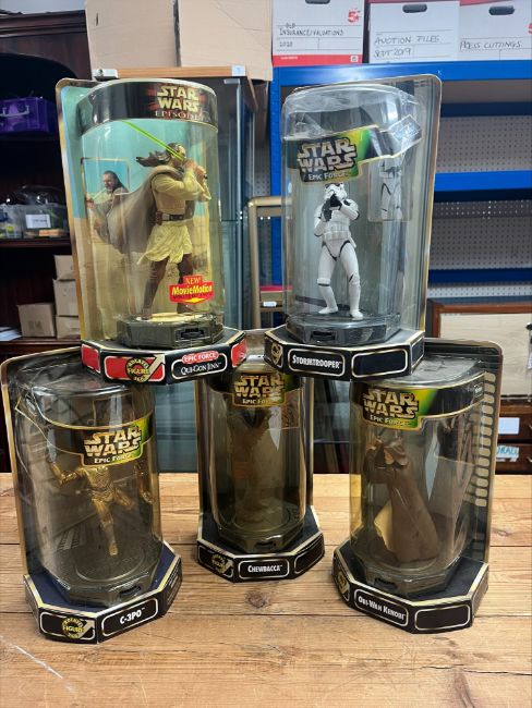 A set of five Hashbro rotating figures including Obi-Wan Kenobi, Stormtrooper, Qui-Gon Jinn, C3PO and Chewbacca.