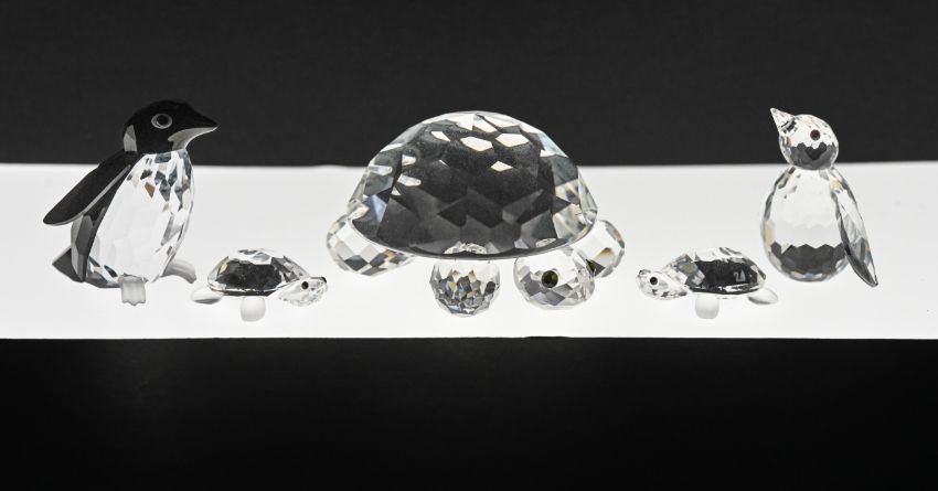 Swarovski Crystal Glass. Two Turtles and two Penguins, boxed.