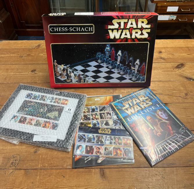 An assortment of Star Wars merchandise including a Star Wars chess set, two sets of Star Wars postage stamps, Star Wars Episode 1 sticker collection by Merlin and one framed set of Star Wars first day issue stamps dated 20th October 2015.