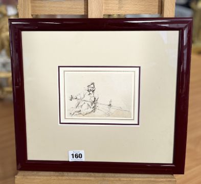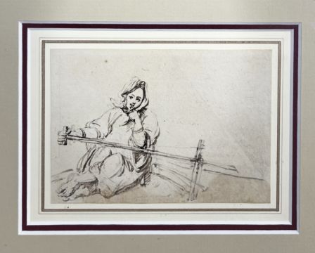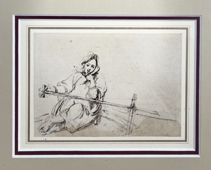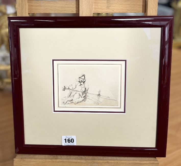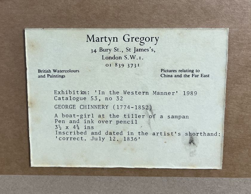 George Chinnery (1772-1852) 'A Boat Girl at the Tiller of a Sanpan', pen and ink over pencil, label on reverse, Martin Gregory Gallery, London, 1989 Exhibition 'In the Western Manner', catalogue 53, number 32, the artwork inscribed and dated in the artist's shorthand, July 12th, 1836', overall size is 8.5cm x 12cm, framed and glazed. A work of a 'Tanka Boatwoman by her Dwelling' in oil depicts a similar figure is in the Hong Kong and Shanghai Banking Corporation,