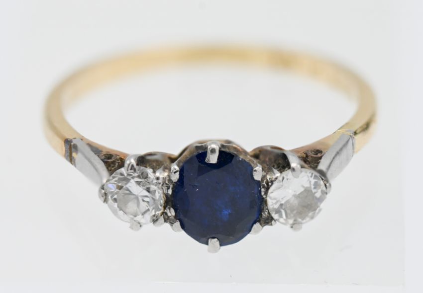 An 18ct platinum and sapphire and diamond set three stone ring