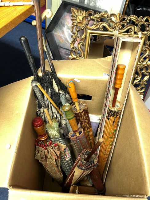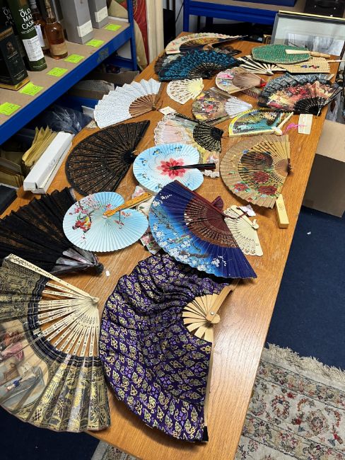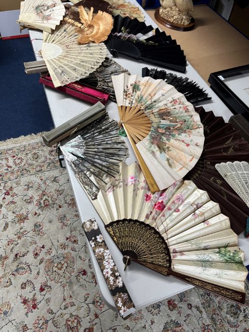 A large collection of various fans and parasol together with reference books.