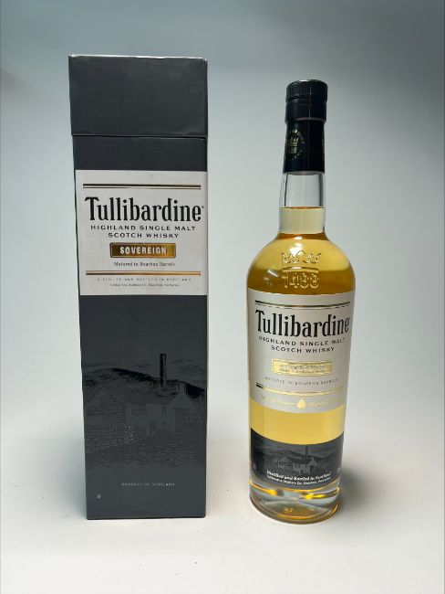 A bottle of Tullibardine Highland Single Malt Scotch Whisky Sovereign, matured in Bourbon barrels, distilled and bottled at the Tullibardine Distillery (est.1488) in Scotland, with box, 70cl.