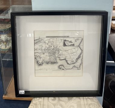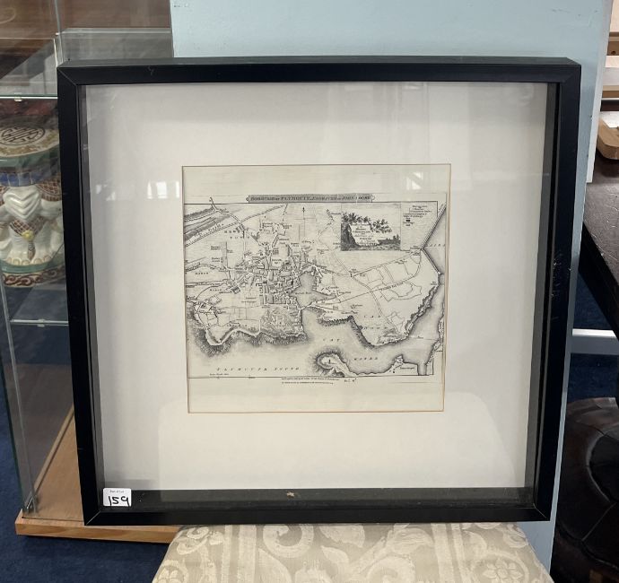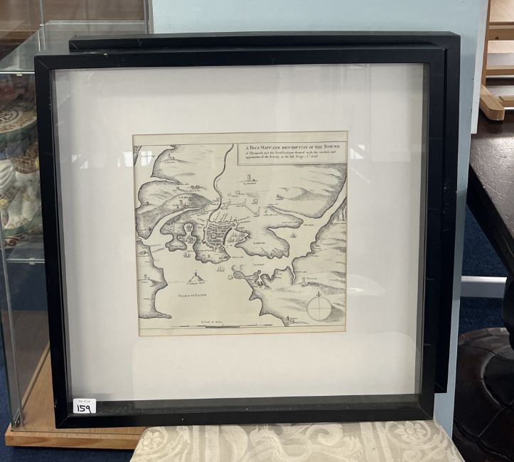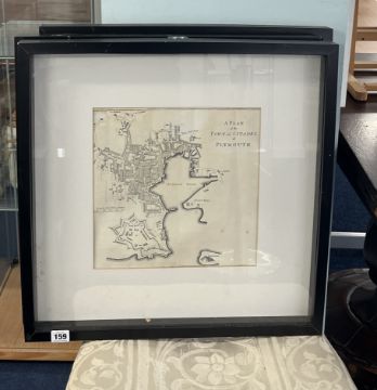 Three framed Plymouth maps including a plan of the town and citadel, framed and glazed, overall size 53cm x 53cm.