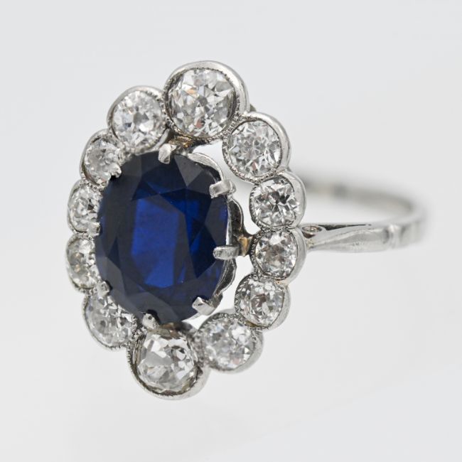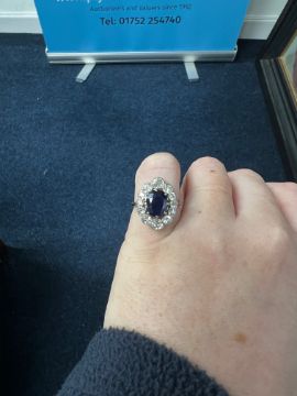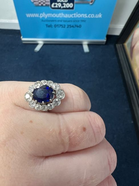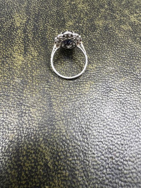 A fine diamond an sapphire cluster ring, 18mm x 14mm (head size), size L.