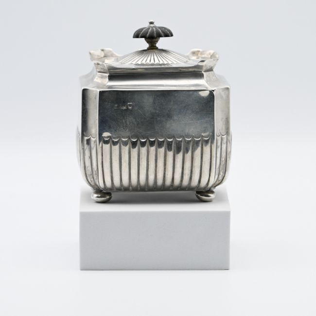 A silver tea caddy of octagonal shape with bun feet and hinged lid with a turned finial, London hallmark, Mappin Brothers, London, approx. 8.04oz.