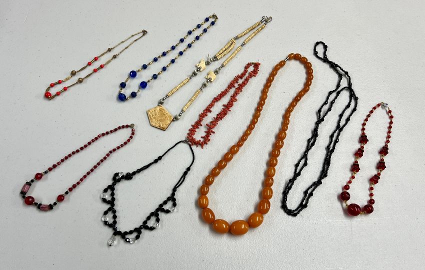 A small collection of dress jewellery including an Amber style bead necklace and other necklaces.