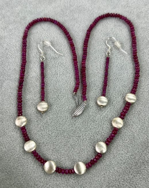 A modern 9ct white gold ruby bead necklace, together with matching earrings.