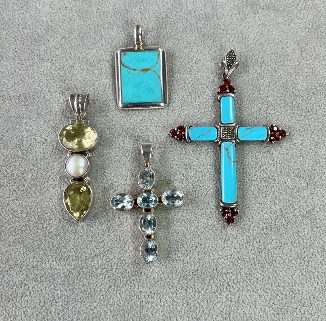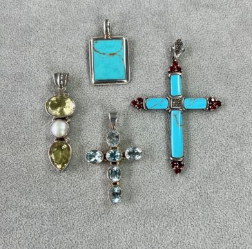 Two modern silver stone set crosses and two similar pendants (4).