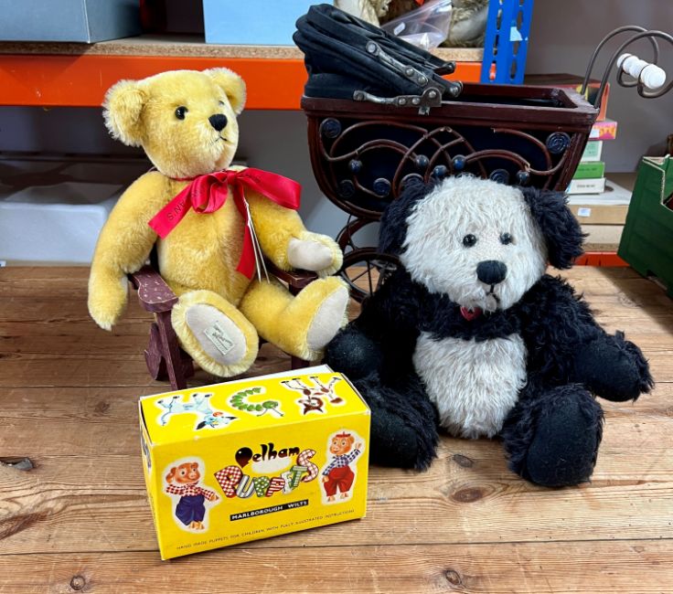5 items to include; 2002 35cm Deans collectors club bear, 1999 40cm Pamela Woolley Panda bear, Marlborough Wilts Pelham puppet with box, 40cm model pushchair and a 25cm garden chair.