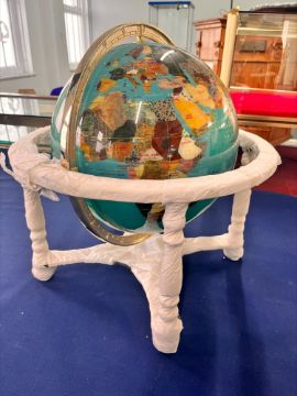 A semi-precious gemstone globe, each type of stone is placed geographically on the globe according to their country of origin, complete with 360 degree movable stand and tag.