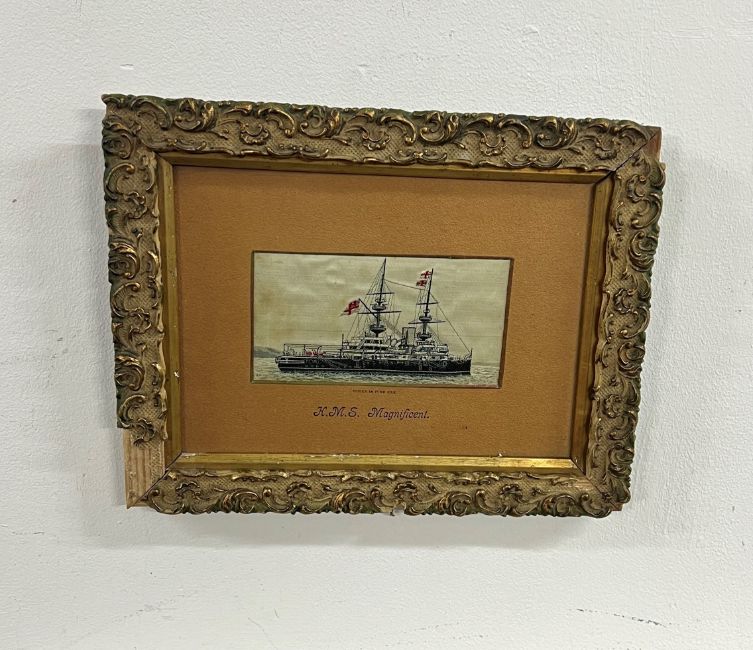 A Stevengraph of H.M.S. Magnificent, woven in pure silk. 7cm x 13cm, framed and glazed.